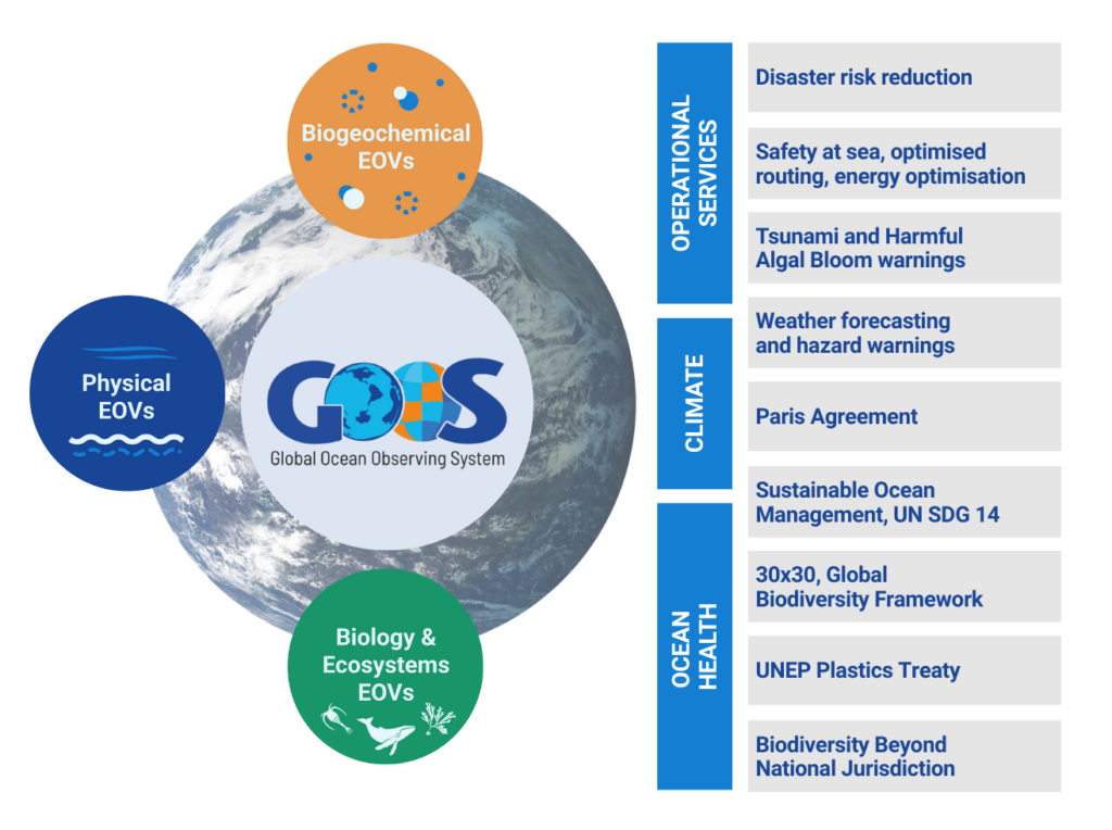 Since its inception in 1991, the Global Ocean Observing System (GOOS) has worked toward a single overarching goal: to enable a truly global, coordinated, and sustained ocean observing system. that delivers the essential information needed for our sustainable development, safety, wellbeing and prosperity. Central to this vision is the concept of Essential Ocean Variables (EOVs), defined as the minimum set of ocean observations that are needed to assess ocean state and variability for important global ocean phenomena, and to provide essential data for applications that support societal benefit.
